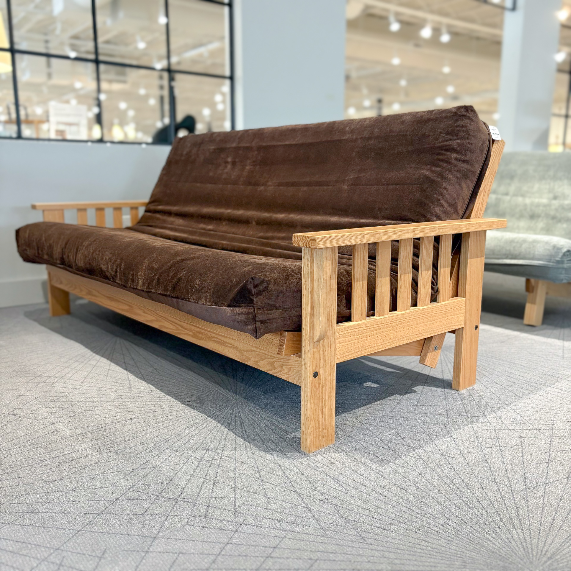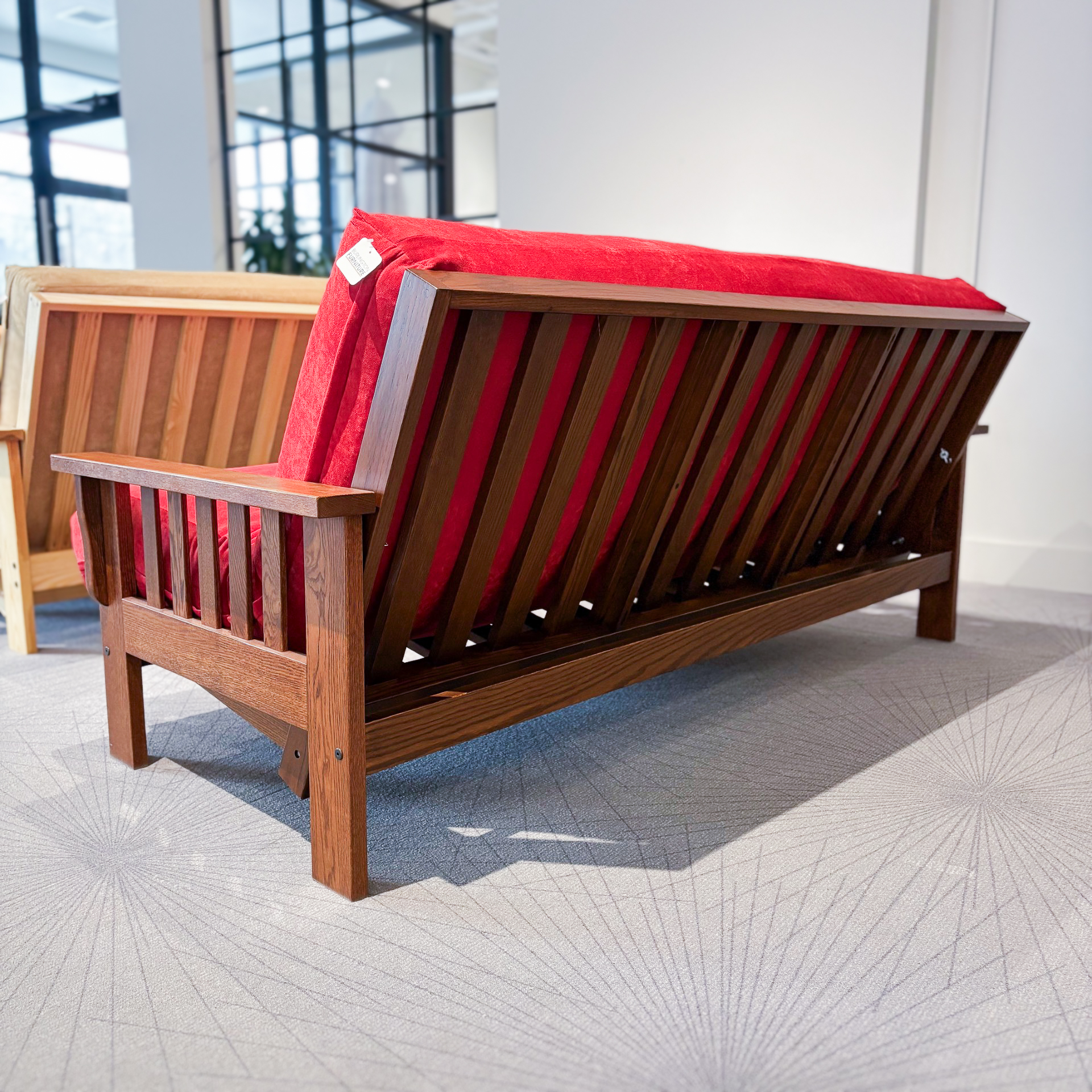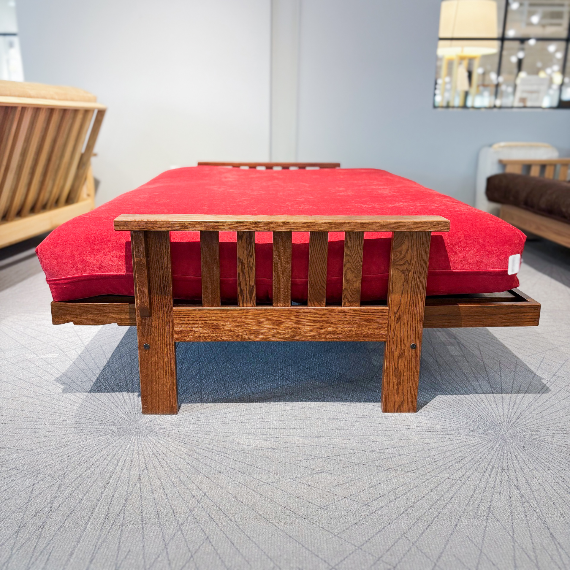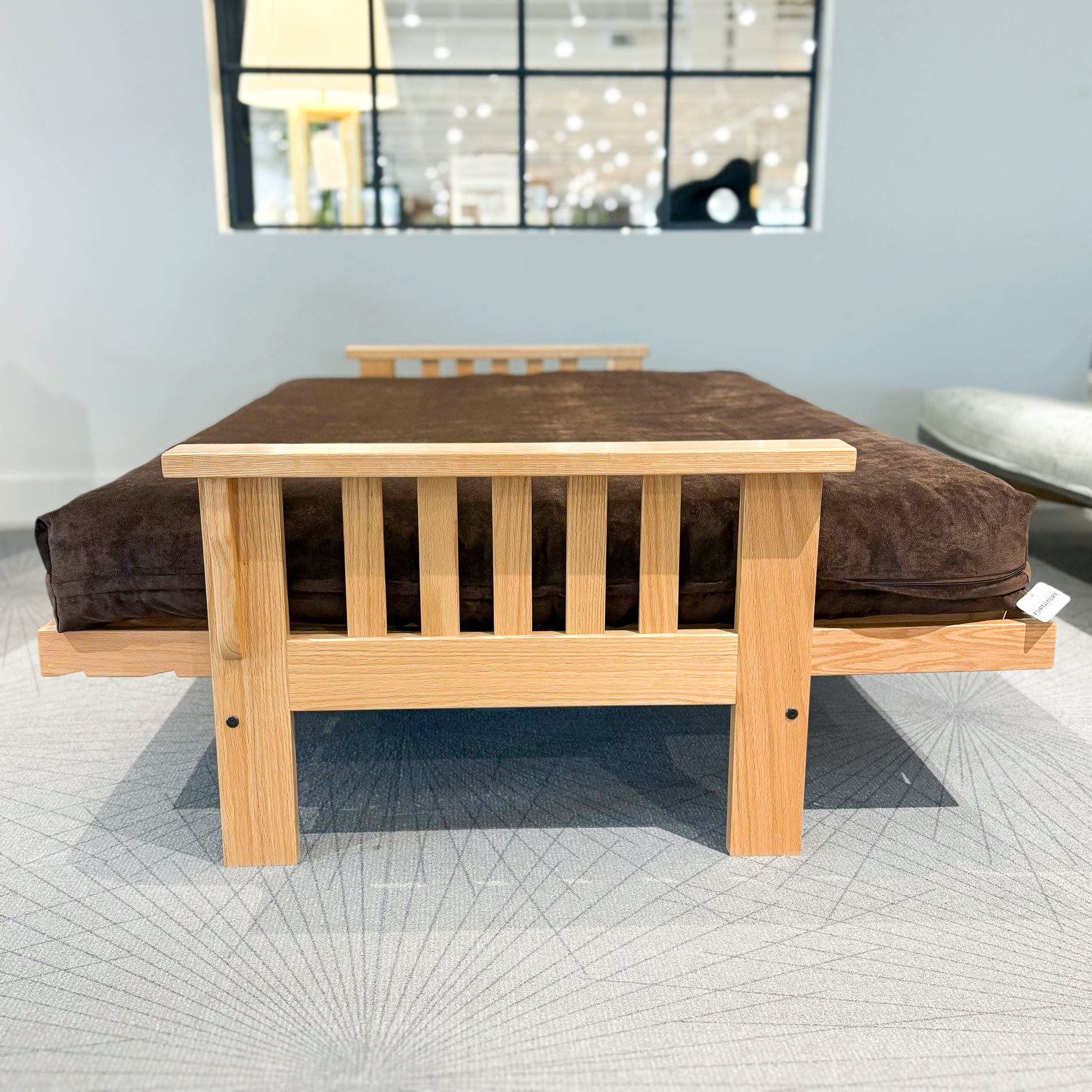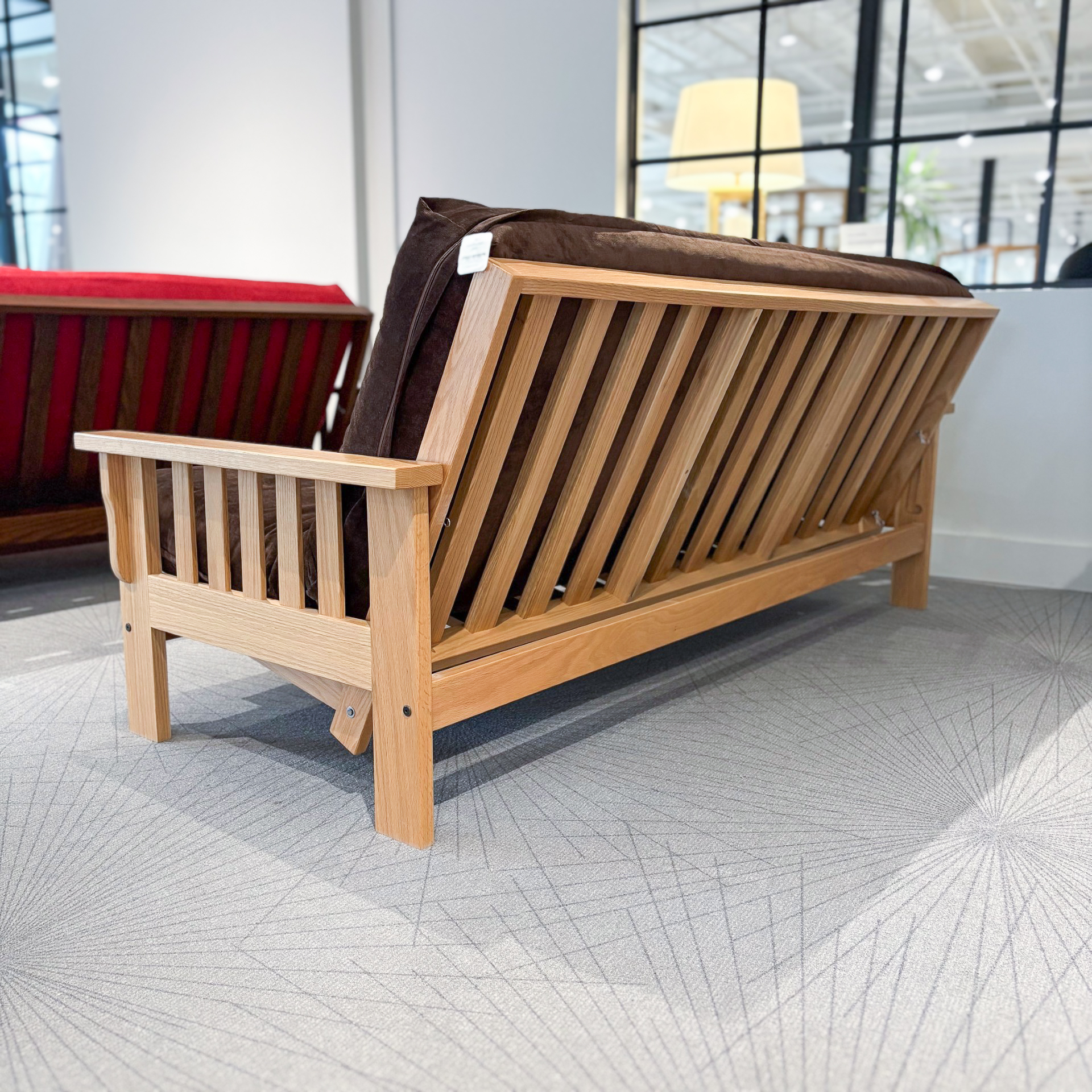 The Lancaster Futon Frame is a beautiful, traditionally made Oak frame, with two available stains in Medium (darker shown stain) and Natural (lighter shown stain). This frame opens effortlessly from the front and unfolds to its bed form with the arms acting as a foot and headboard.