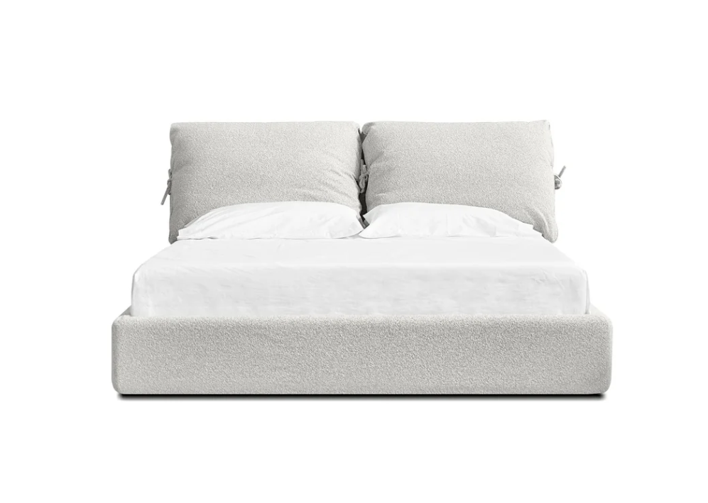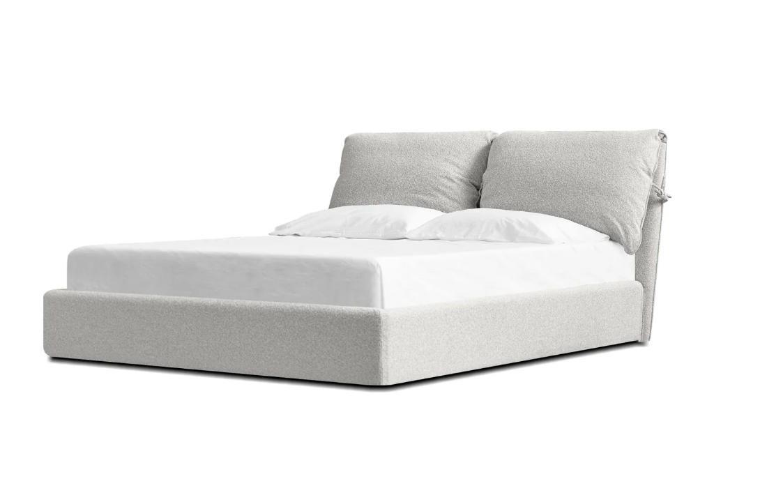 The Loon upholstered bed frame is designed with two extra-large pillows attached with tie-offs to create a cushiony headboard to sit up in bed and rest against. Complete with slats to provide evenly distributed support to your mattress nestled on top.